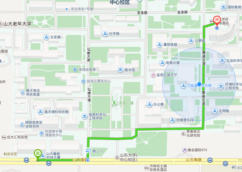 起点为山东大学的西南门,终点为本次会议举办地。车辆可以由此进入;如步行进入学校,需刷居民身份证。