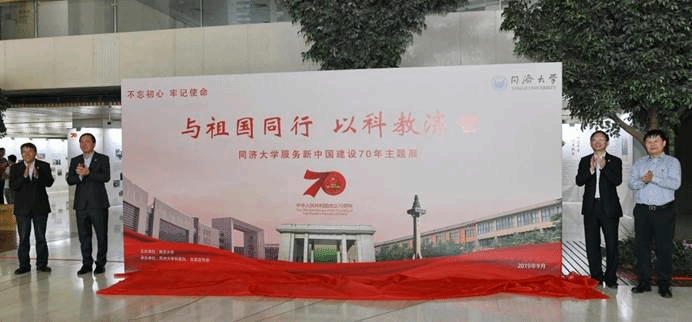 2019年9月26日,“‘与祖国同行,以科教济世’同济大学服务新中国建设70年主题展”在同济大学衷和楼大厅揭幕。展览全面回顾、集中展现了新中国成立70年来,同济大学始终秉承“与祖国同行,以科教济世”的办学传统,为国家重大战略、国家重大工程建设、国家经济社会发展作出的巨大贡献。