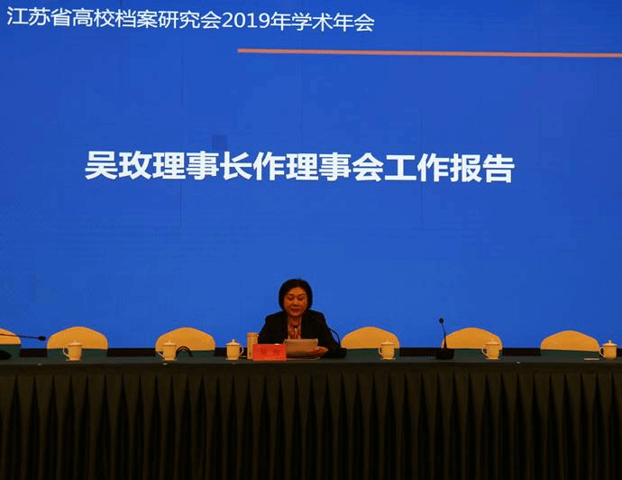 吴玫理事长代表江苏省高校档案研究会第十届理事会作了2019年工作报告,报告对2019年研究会主要工作、全省高校档案工作特色与亮点及明年研究会工作思路进行了总结和概括。